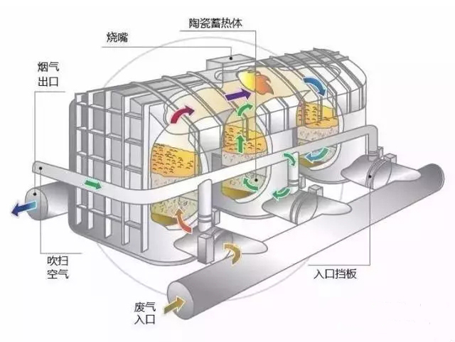 RTO主体结构由燃烧室、陶瓷填料床和切换阀等组成。该装置中的蓄热式陶瓷填充床换热器可使热能得到最大限度的回收,热回收率大于95%,处理VOC时不用或使用很少的燃料。若处理低浓度废气,可选装浓缩装置,以降低燃烧消耗。